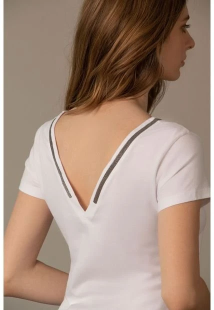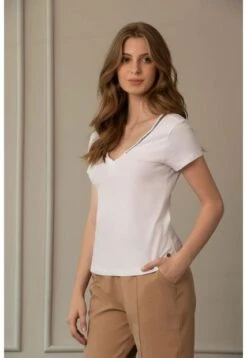 Un básico atemporal con detalles de lujo; nuestra camiseta para mujer de silueta semi holgada es una pieza fundamental en tu closet; su diseño de manga corta con escote en V crea un estilo característico del ADN Vélez, donde los detalles en millaré y el largo a la cadera alta se convierten en los principales protagonistas de tu look.