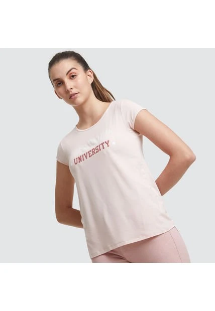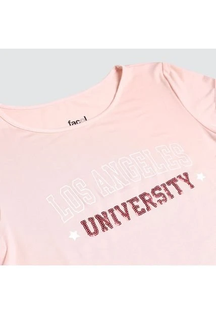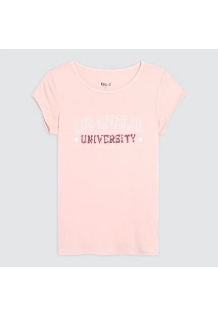 Camiseta para Mujer cuello redondo, manga corta con screen en lentejuelas university. No dejar en remojo, lavar en agua fría separadamente, no usar blanqueador, no retorcer, secar a la sombra. Plancha tibia.