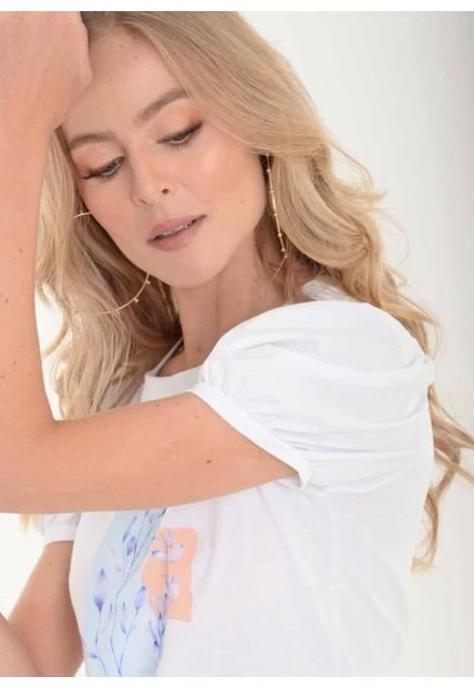 Camiseta en tejido de punto fondo entero con estampado localizado en frente, manga corta con recogido