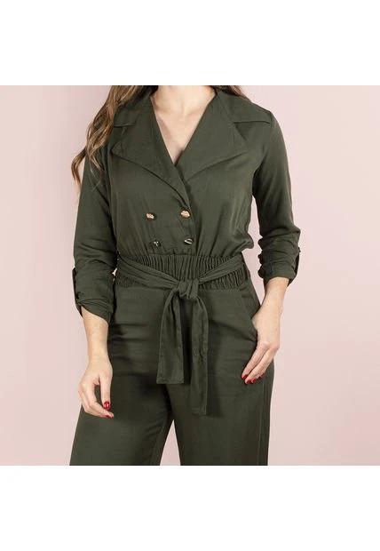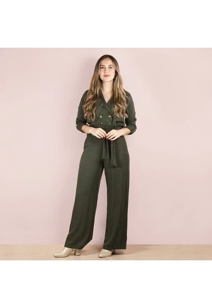 Enterizo largo bota ancha color verde, para dama. Su diseño es de textil, cuenta con un resorte de en la parte frontal a la altura de la cintura y una correa de tela para amarre,tiene bolsillo laterales, botones de adorno y un diseño en corte de V en el cuello. Es perfecto para estilos cómodos y elegantes