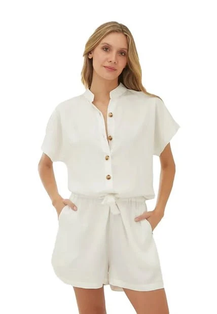 El enterizo corto Hazel es moderno y elegante, presenta una silueta semi ajustada que acentúa tus curvas de todas las formas posibles. El cuello neru añade un toque de sofisticación y comodidad, mientras que la cintura funcional con cordón ciñe tu cintura a la medida para un look favorecedor. Las mangas remangadas le dan un aire desenfadado y relajado, perfecto para un día con los amigos o una escapada de fin de semana. Además, los bolsillos laterales te permiten llevar tus cosas a mano sin perder un ápice de estilo. El mono corto Hazel para mujer es el complemento perfecto para tu armario de verano, tanto si lo llevas con tacones como si lo prefieres informal con zapatillas.