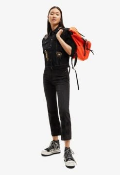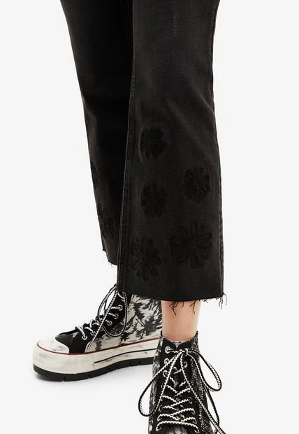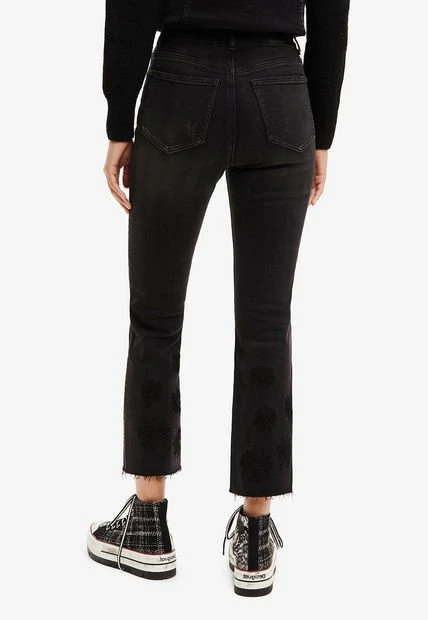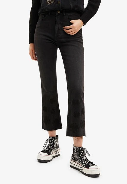 Vaquero ajustado con cintura alta, bajo acampanado cropped raw-cut y tejido con un punto elástico muy confortable. Liso con flores bordadas a tono. Somos un miembro orgulloso de la Better Cotton Initiative. Al comprar prendas de algodón de Desigual estás apoyando un cultivo de algodón más sostenible.