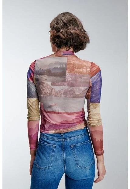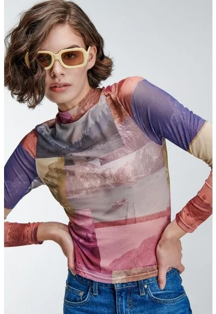 Camiseta crop top para mujer, en mesh completamente estampado con diseño, cuello alto; manga larga, silueta ajustada.