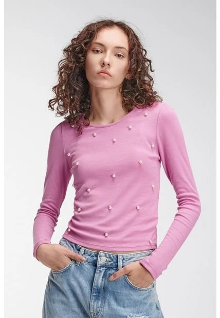 Camiseta para mujer, manga larga, unicolor, cuello redondo con recogido en manga.