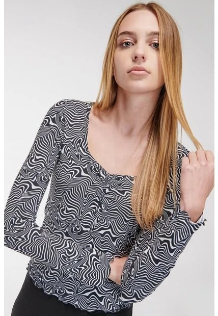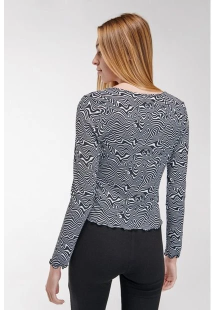 Camiseta para mujer, manga larga, estampada, cuello redondo con recogido en frente.