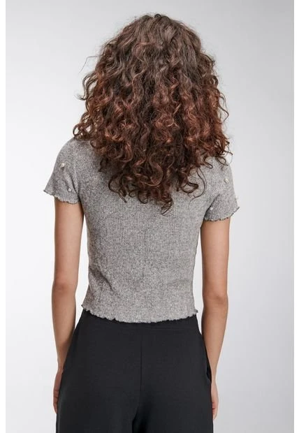 Camiseta para mujer manga corta, en tela acanalada, con perlas en mangas y frente.