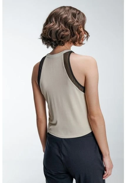 Camiseta fit, cuello redondo sin mangas, con detalle sobre la sisa en malla y en tono contraste, estampado sobre el frente.