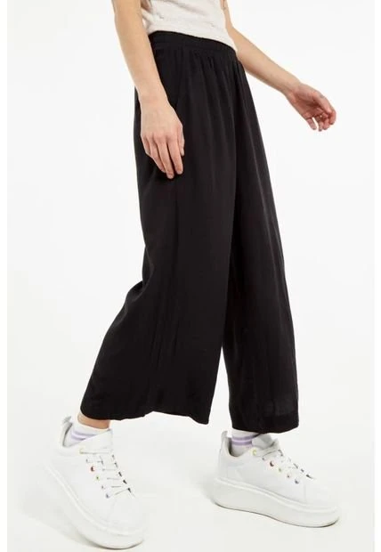 Pantalón culotte para mujer en tono negro tiene tiro alto, un elástico en la pretina, diseño de botas anchas y un fit holgado a la silueta de tus piernas. Crea un outfit moderno combinándolo con una blusa y unos tenis altos, será ideal para disfrutar de tus planes casuales o cotidianos con amigas.