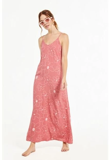 Vestido solo fondo en color rojo empolvado de silueta larga con escote en V y tirantes finos para anudar hacia el posterior, lleva elástico por centro espalda para mayor comodidad.