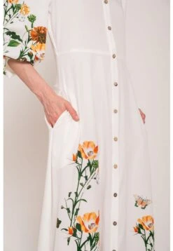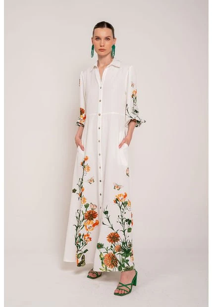 Maxi Vestido para mujer camisero con estampado localizado en parte inferior y mangas. Esta silueta tiene mangas bombachas que ajustan con puño y botón, silueta amplia con ajuste en cintura. Un vestido ideal que te hará lucir fresca y femenina en cualquier ocasión. Con unos zapatos kitten heels el contraste entre moderno y clásico, es siempre un acierto para aportar un toque más elegante.
