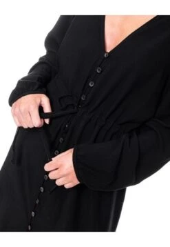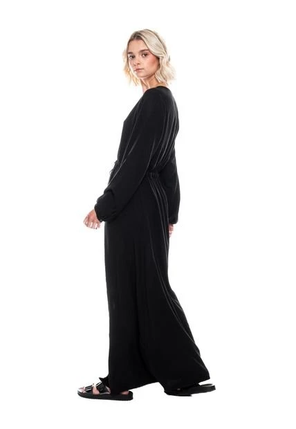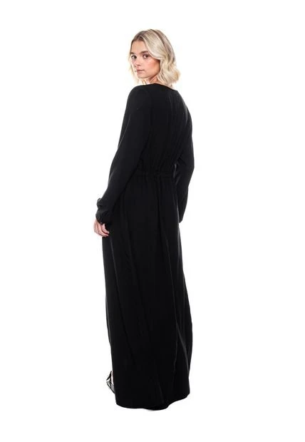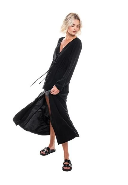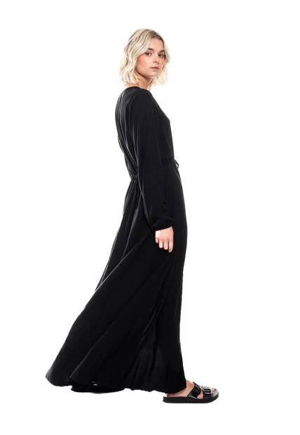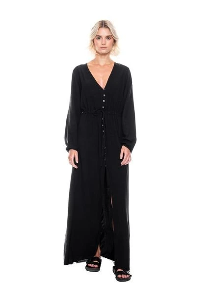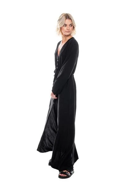 Maxi vestido manga larga, escote en v con botonadura en centro delantero, con tira de amarre en cintura unicolor. Esta prenda está hecha con el corazón por manos Colombianas.