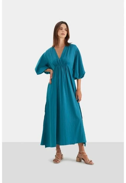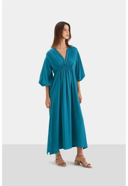 La sostenibilidad es una característica representativa de la esencia Vélez, por esto, nuestro maxi vestido es elaborado en tejido plano sostenible, siendo una propuesta de moda responsable con el entorno. Esta pieza de aire contemporáneo sofisticado, cuenta con escote en V, elástico en frente y puños, manga larga tipo globo, prenses en hombros y aberturas en los costados, siendo ideal para crear looks para clima cálido con sandalias y accesorios, o para clima templado con tenis o botines y chaqueta de cuero.