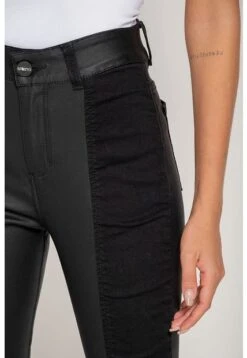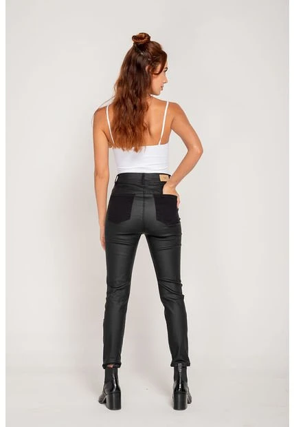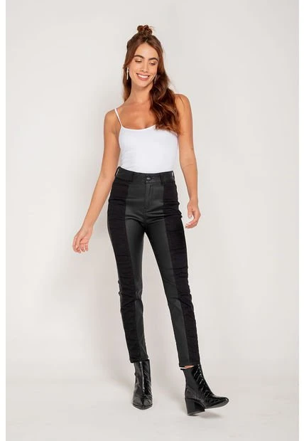 Pantal贸n para mujer tiro alto con cortes en contraste en los costados, largo, silueta skinny con bolsillos tipo parche en parte posterior. Un must have de temporada. Armoniza con una blusa de gran ca铆da y ligera, con botines cowboy o de tac贸n.