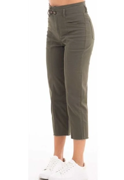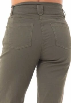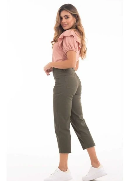 Pantalón en dril fondo entero, tiro alto, bota recta ruedo deshilachado, bolsillos en delantero y de parche atrás.