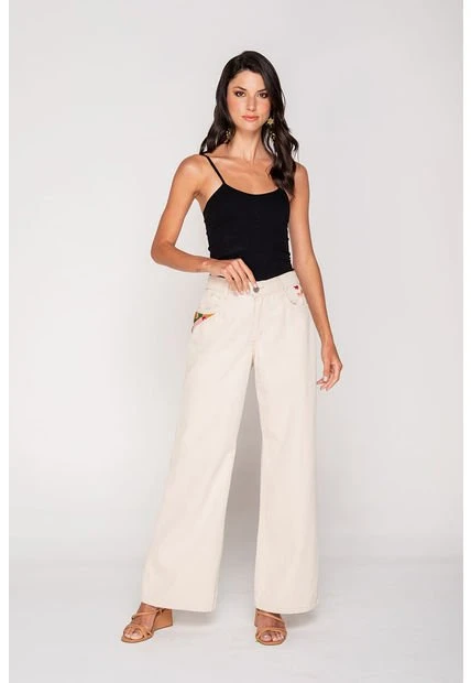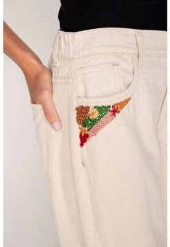 Pantalón para mujer mom fit cinco bolsillos, con bordado hecho a mano en bocas de bolsillos delanteros. Prenda ecológica. Tiro alto. Silueta amplia. Una prenda ideal para crear looks del día a día y perfecta para el fín de semana. Siempre puedes combinarlo con botas, sandalias, botines y hasta tennis, todo depende del estilo que deseas llevar y la ocasión.