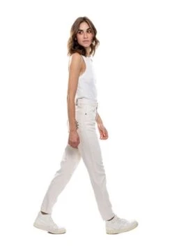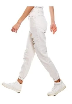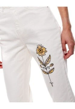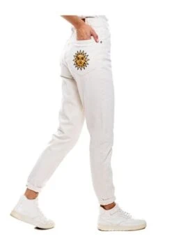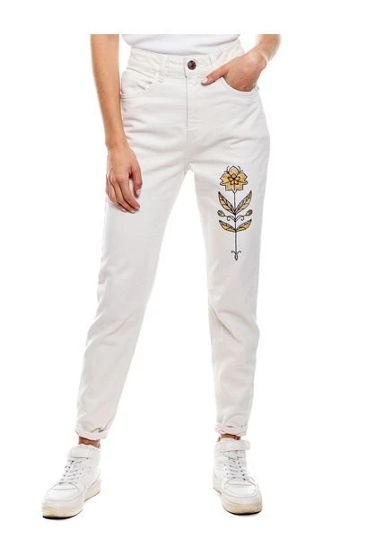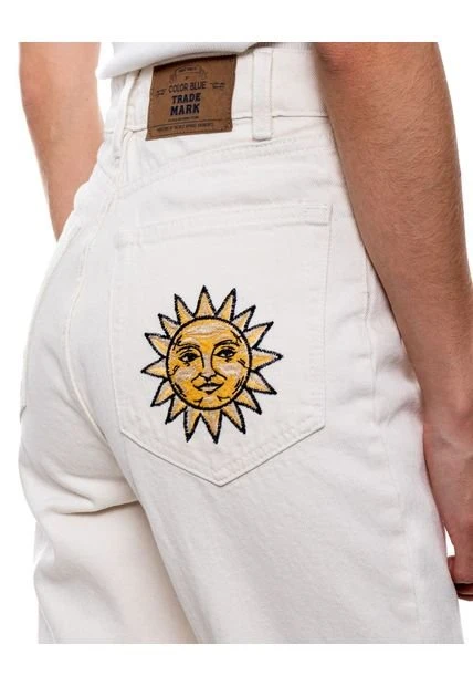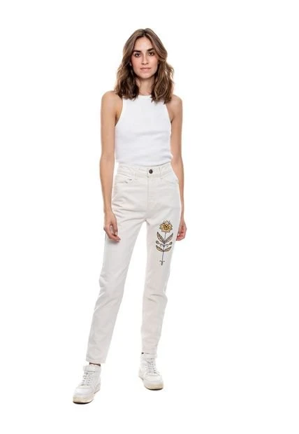 High waist mom fit, pantalón con detalles bordados en bolsillo y frente. Esta prenda está hecha con el corazón por manos Colombianas.