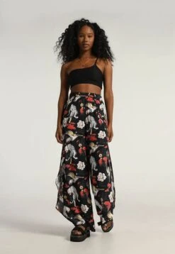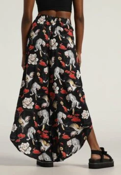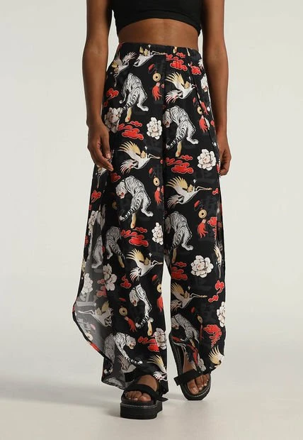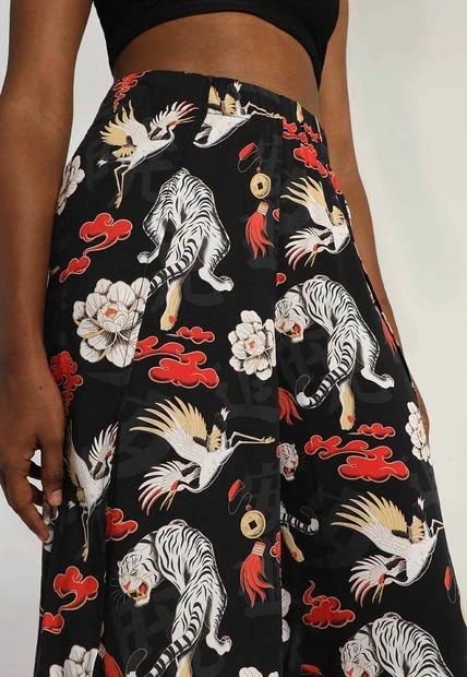 A帽ade un poco de ligereza a tu look y t贸mate la vida con calma. Este pantal贸n harem en color neutro negro se caracteriza por mantener un corte holgado a lo largo de las piernas; presenta una pretina a la altura de la cintura. Estampa un dise帽o muy colorido que se inspira en la tradici贸n china. Intenta combinarlo con un top o crop top y unas sandalias de plataforma. Viste joven, viste estilo Mattelsa.