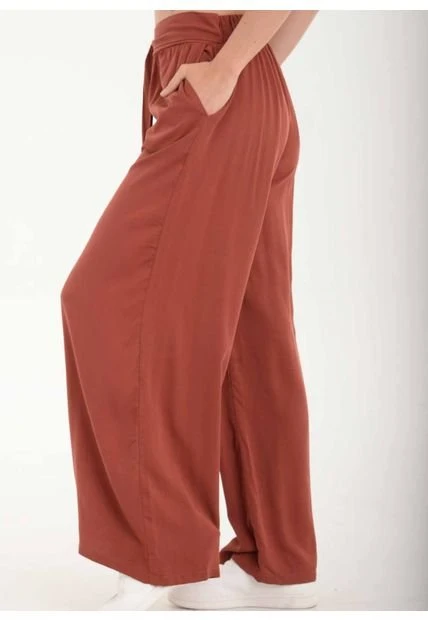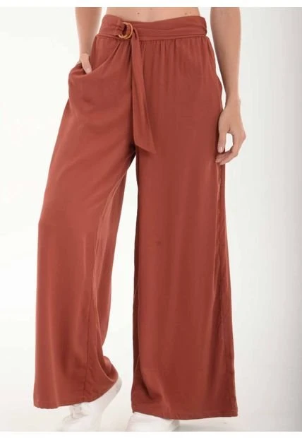 Pantalón tipo palazzo en chalis fondo entero, detalle de cinturon en la misma tela con argolla, bota amplia.
