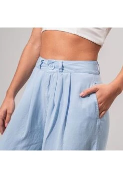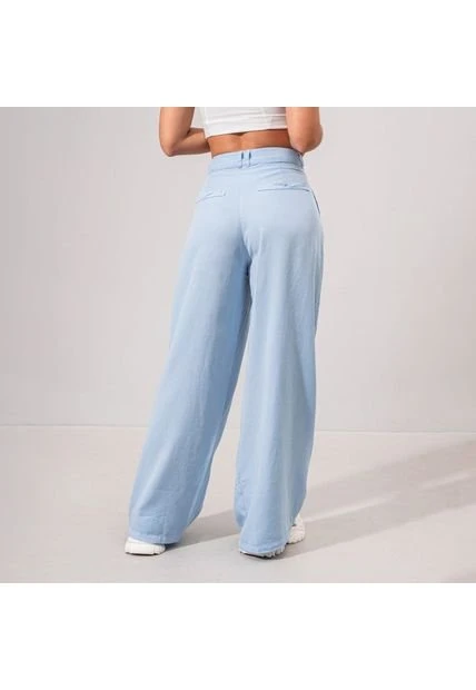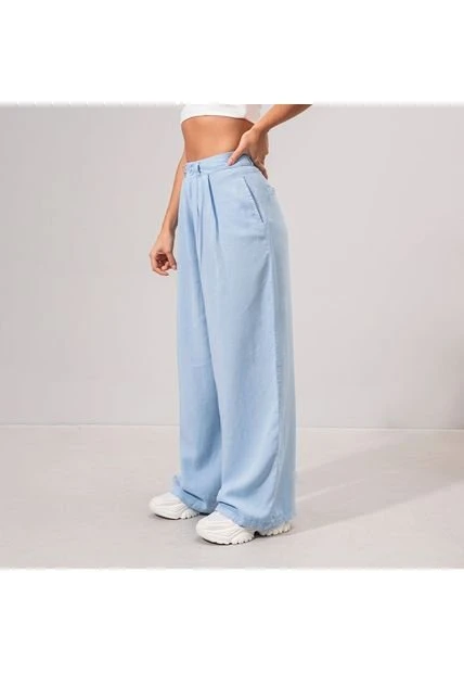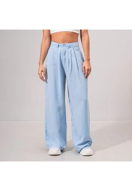 -Pantalon talle alto -Silueta semia mplia -Bota recta -Pretina con boton -Prenses en frente -Tejido plano con caida -Color Azul claro Material: 100% LYOCELL