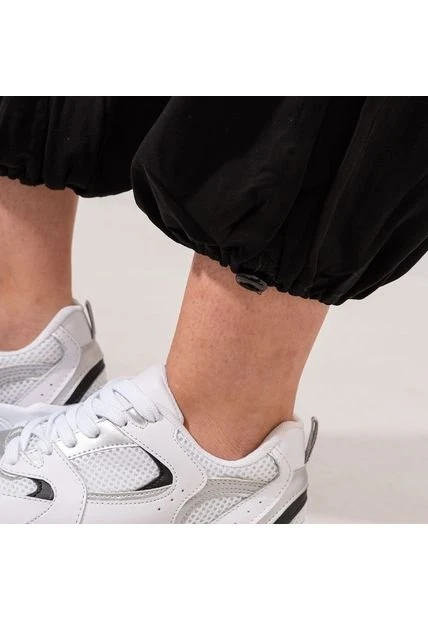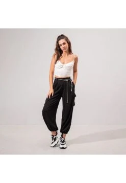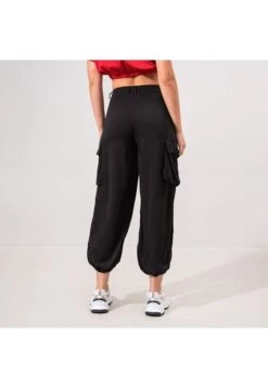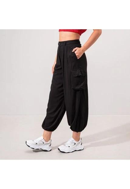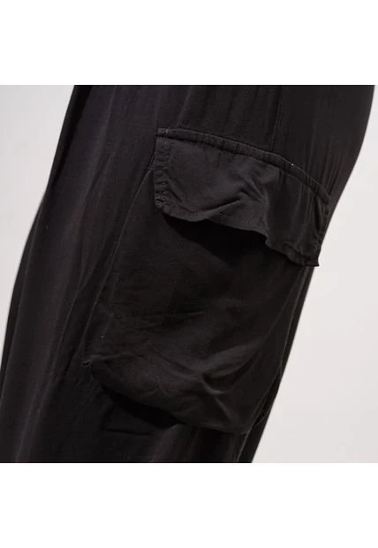 -Pantalon cargo -Talle medio -Silueta amplia -Bolsillos laterales -Elastico ajustable en bota -Tejido plano con caida -Color negro Material: RAYON VISCOSA 100%