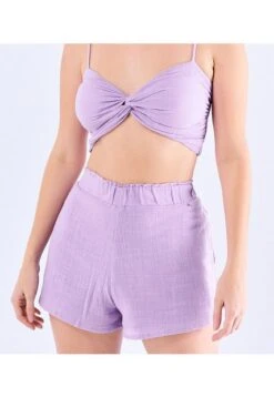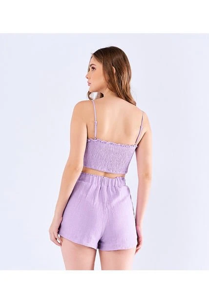 Descripción del producto: Set para mujer con crop top encauchado de tiras y short con bolsillos funcionales en tela tipo con apariencia de lino.