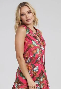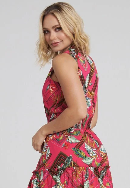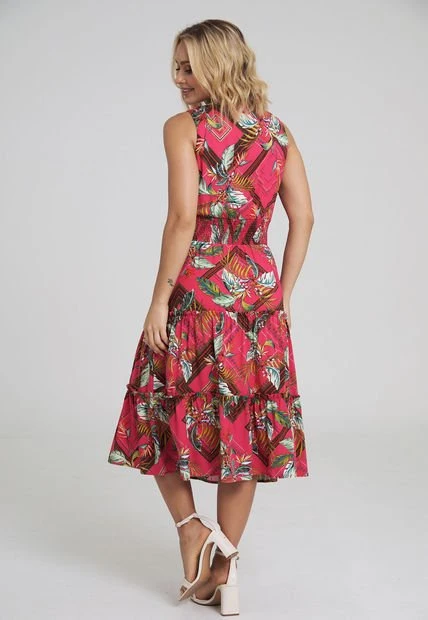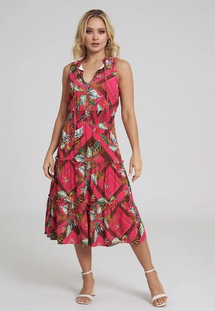 Vestido midi en chalís estampado, forrado y escote mini ruche con abertura, cintura resortada, falda con faroles y ruche decorativo. RAGGED es una empresa competitiva y sólida que cuenta con más de 30 años de experiencia con su propuesta de diseño y moda,