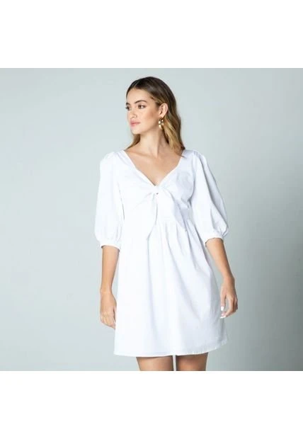 VESTIDO BLANCO CON ANUDADO EN FRENTE ESCOTE U EN ESPALDA MANGA 34 LARGO 93CM – ALGODON 97 ELASTANO 3