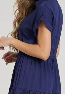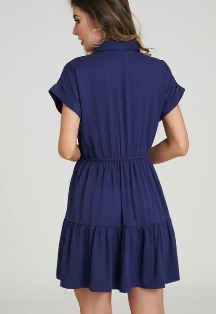 Vestido corto faroles en chalis fondo entero, cuello camisero, perilla completa con botones, jareta con detalle de amarre en cintura, manga corta con guardapolvo.