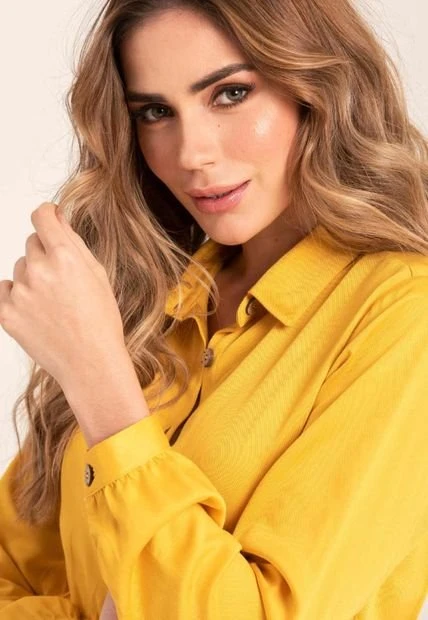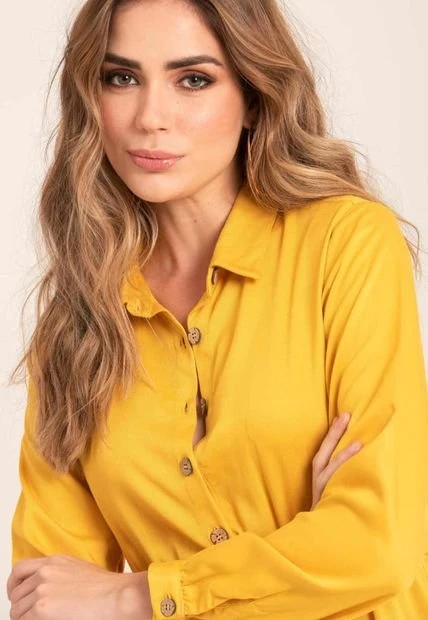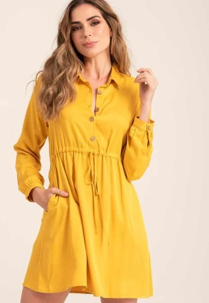Vestido corto en chalis fondo entero, cuello camisero, perilla media con botones, túnel en cintura con jareta, bolsillos laterales, manga larga con puño y botón, silueta semi-ajustada.