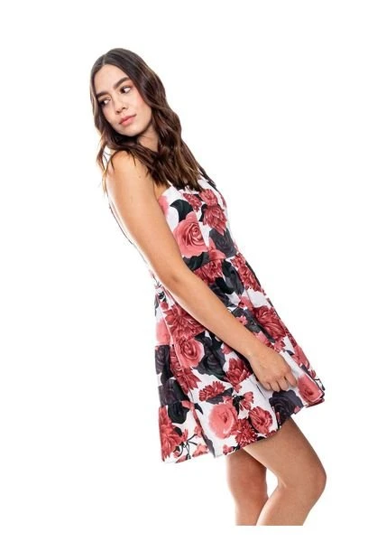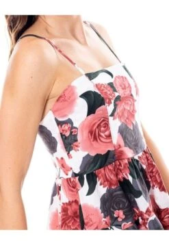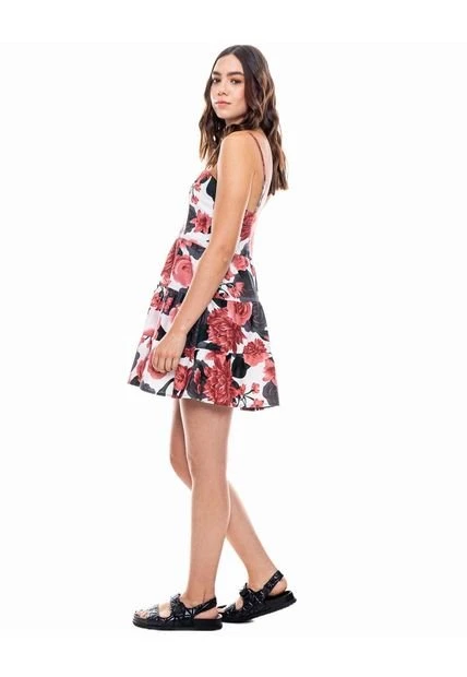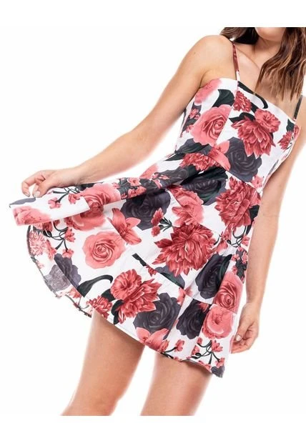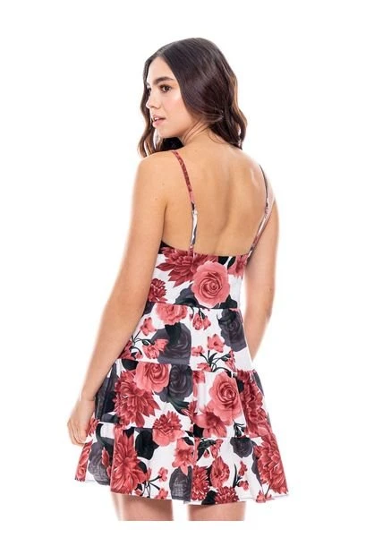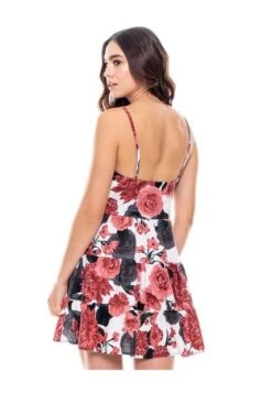 Vestido de tirantes corto con boleros recogidos y estampado de flores. Esta prenda está hecha con el corazón por manos Colombianas.