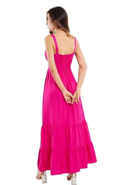 Vestido largo con tirantes en chalis fondo entero, anudado en escote con abertura frontal, corte en cintura, bolsillos, bolero en ruedo con recogido. RAGGED es una empresa competitiva y sólida que cuenta con más de 30 años de experiencia con su propuesta de diseño y moda,