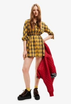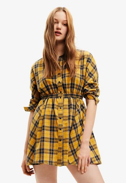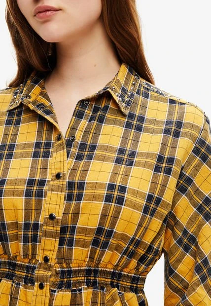 Vestido corto camisero, confeccionado en algodón, con estampado de cuadros en colores mostaza y negro, con botones snap y cintura fruncida. Cuello cutaway, Cierre de botones