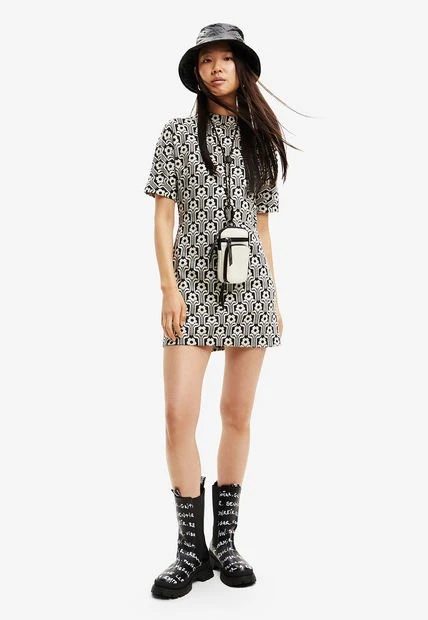 Un vestido de punto, minifaldero, femenino y corto, que tiene un estampado all-over con un diseño geométrico muy setentero en dos colores.