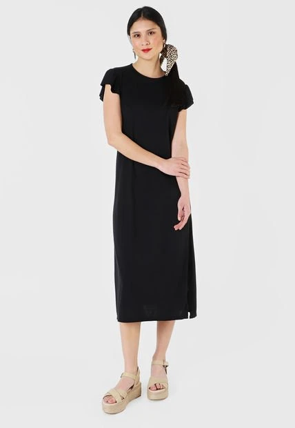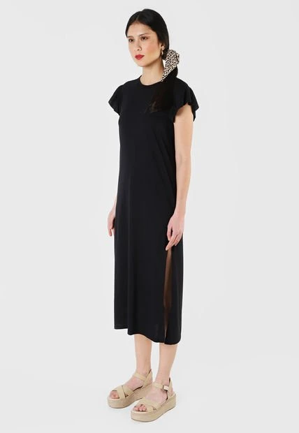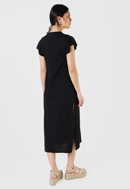 Este vestido es una prenda elaborada en poliéster y en algodón; presenta una horma ancha así como una apertura que va desde la altura de la pantorrilla y hasta el dobladillo; es de cuello redondo, manga corta y corte largo. Con refuerzo de costuras en los bordes del cuello y las mangas, lo cual le proporciona mayor estilo. Luce este vestido color negro para ocasiones en las que debas vestir casual, puedes acompañarlo con tus tenis blancos favoritos.
