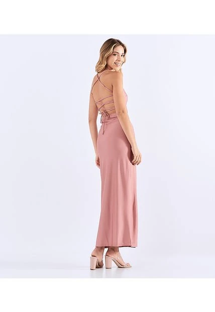 Descripción del producto: vestido dama unicolor tiras espalda trenzada. largo al tobillo con abertura en costado delantero. insumos plateados marcados derek.