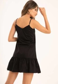 Vestido corto tirantes en popelina, fondo entero, escote en V, bolero decorativo en ruedo.