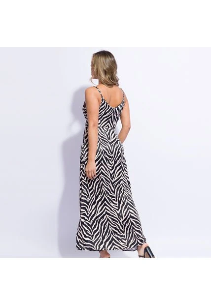 El vestido tiene tiras ajustables y una apertura en la parte del frente.