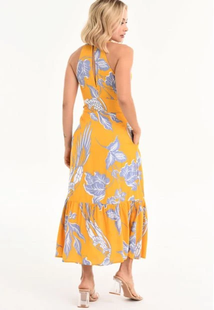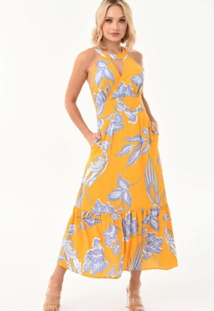 Vestido largo en chalís estampado y forrado, escote halter cruzado en busto, ajusta en cintura, falda larga línea A con bolero. RAGGED es una empresa competitiva y sólida que cuenta con más de 30 años de experiencia con su propuesta de diseño y moda,