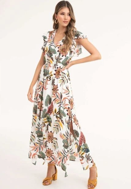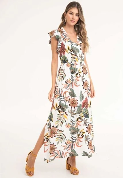 Vestido largo en chalis estampado, escote en V, detalle de amarre en espalda, manga corta con bolero, elástico en cintura, aberturas laterales, forrado en chalis fondo entero.